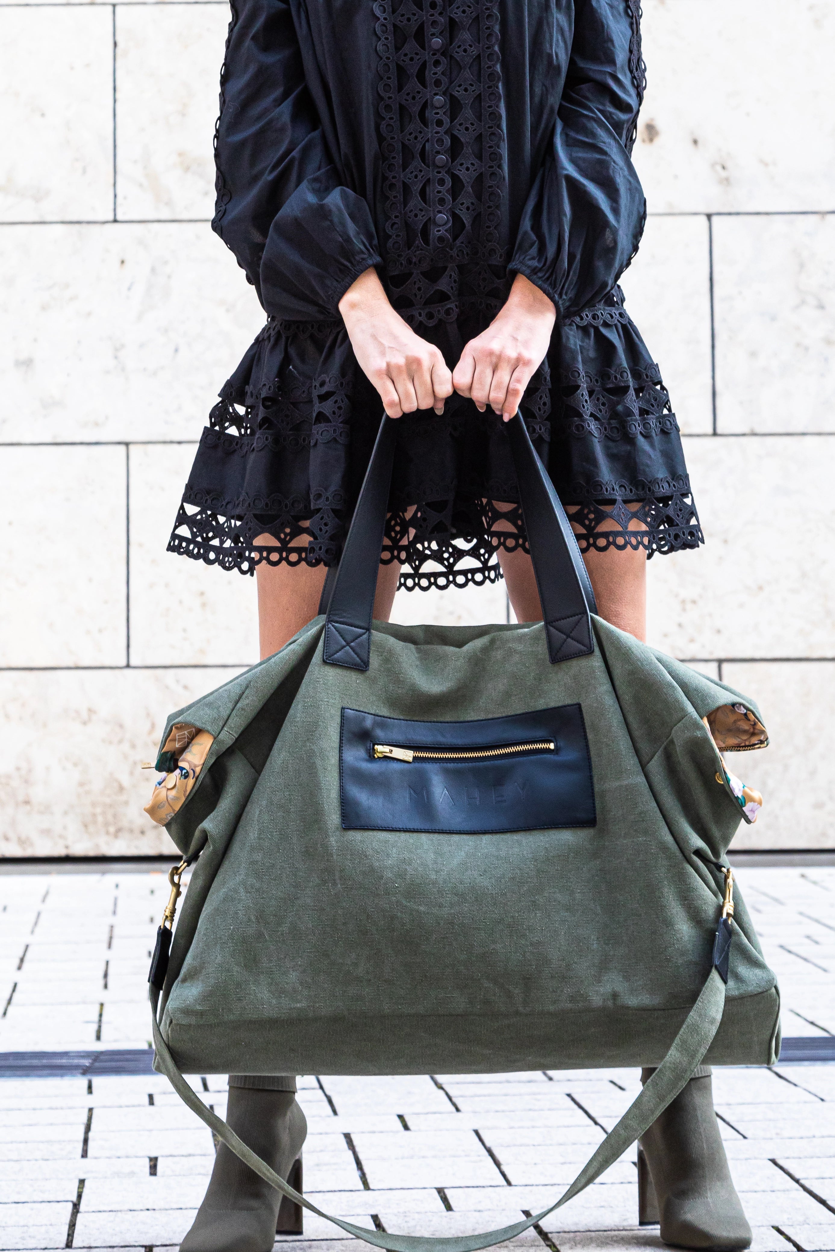 Die Produktion erfolgt ausschließlich in Europa. Die Tasche besteht aus robustem Canvas in Used-Optik mit Details aus feinem Kalbsleder und edel matt glänzender goldfarbener Hardware. Ein besonderes Highlight jeder Tasche ist das außergewöhnliche, in Italien bedruckte Innenfutter, welches das Öffnen der Tasche zu einem Erlebnis macht.